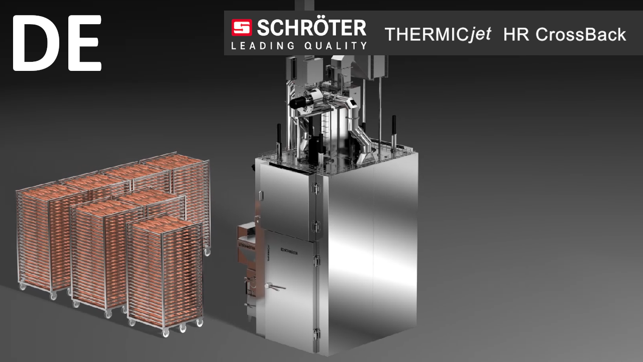 Das CrossBack-Prinzip von Schröter steht für eine innovative Querstrom-Luftführung, die in verschiedenen Schröter-Anlagen wie THERMICjet®, FISHjet®, SEMIjet® und BAKEjet® integriert werden kann. Dieses System wurde speziell entwickelt, um flache Produkte bei hoher Wagenbelegung besonders schonend und gleichmäßig zu verarbeiten. Ob Fleischwaren, Fischprodukte, pflanzliche Alternativen oder Snackprodukte – CrossBack sorgt durch seine reversible horizontale Luftführung für perfekte Ergebnisse bei unterschiedlichsten Anwendungen.