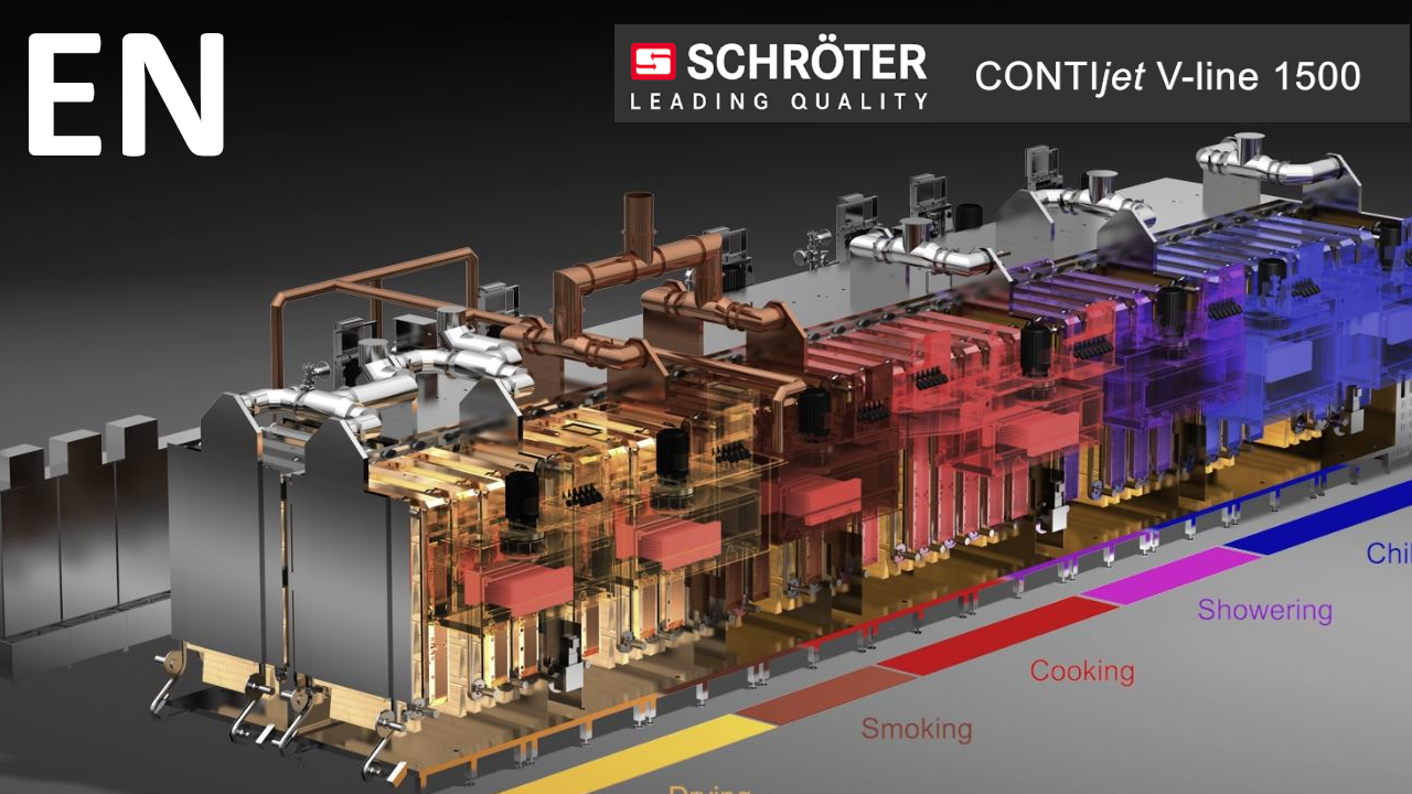 The CONTIjet® is the solution for fully continuous production processes in which the focus is on automation for maximum efficiency and consistent product quality. The system processes large quantities of identical products in the shortest possible process time, with minimal weight loss and absolute consistency. Whether sausages, bacon, duck, or similar products, the CONTIjet® dries, smokes, cooks, showers, or chills in a continuous workflow and thus meets the strict demands placed on industrial production processes.
