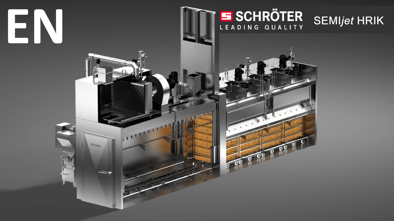 SEMIjet® es una instalación de procesamiento semicontinuo que combina zonas de proceso individuales como ahumado en caliente (HR), cocción (KA), horneado (BA) y refrigeración intensiva (IK) en un solo sistema. Funciona automáticamente, por lotes, y se caracteriza por un sistema de transporte automático y un innovador sistema de control. De este modo, SEMIjet® permite procesos repetibles de forma precisa con una calidad de producto constante.